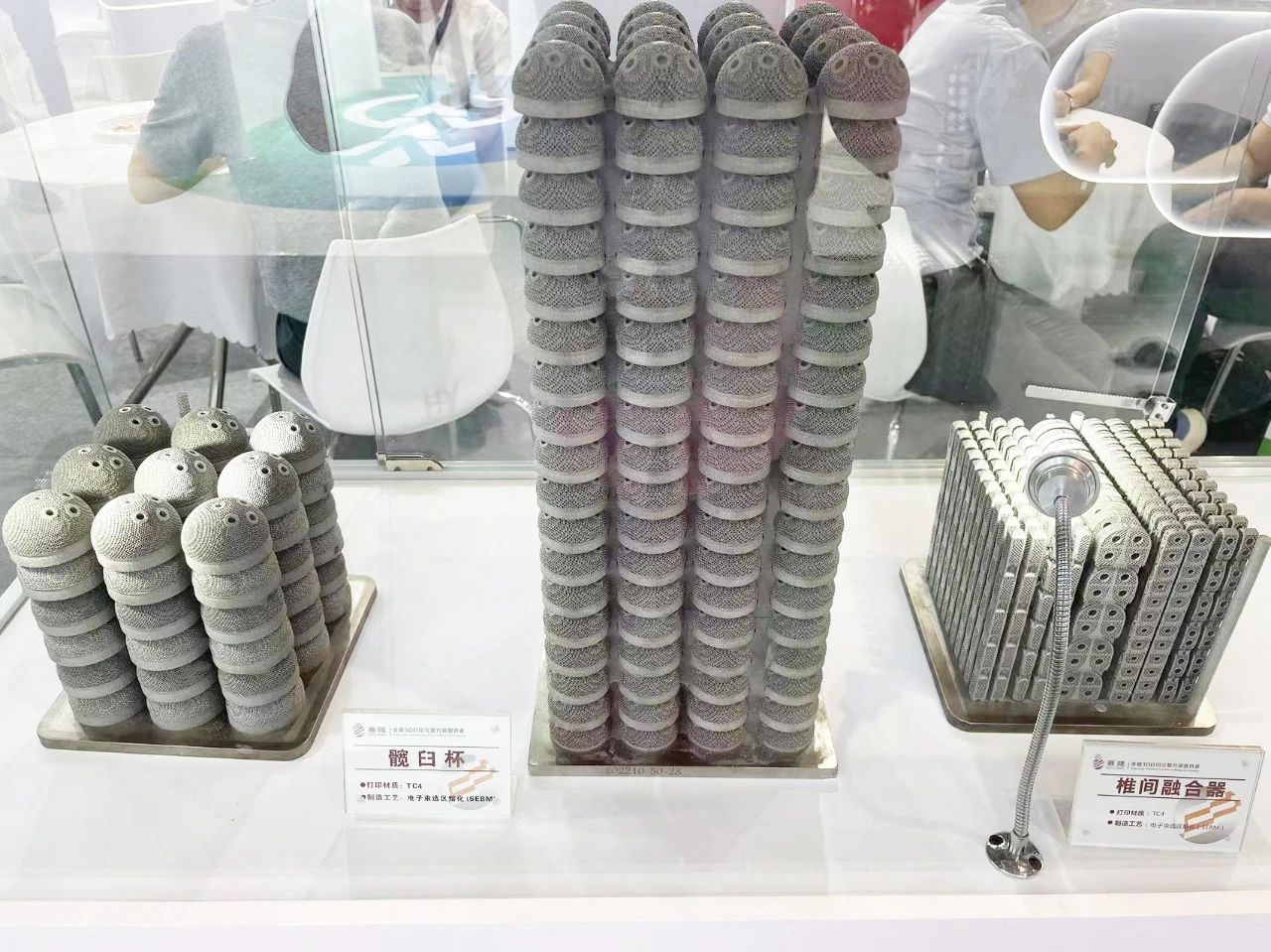 此次TCT展會,西安賽隆重點介紹了自主知識產權、行業獨有的搭載間熱式電子槍的系列化電子束3D打印設備及超高轉速的桌面級和工業級等離子旋轉電極霧化制粉設備,并面向不同的應用領域,展示了電子束3D打印最新案例。在醫療領域,西安賽隆展示了不同成形尺寸的滿板鈦合金椎間融合器、滿板鈦合金髖臼杯以及高精度多孔鉭髖關節、膝關節墊塊,目前公司已成功助力邁瑞骨科3D打印髖臼杯系統獲三類醫療器械注冊證。在汽車領域,西安賽隆展示了電子束3D打印半軸類和輪轂類純銅感應線圈,相關產品已在國內20余家汽車零部件龍頭企業的生產線進行驗證及應用,使用效果優異。此外,面向航空領域和科研領域的需求,西安賽隆還展示了300mm鈦鋁葉片、鈦合金雙點陣結構等典型案例。